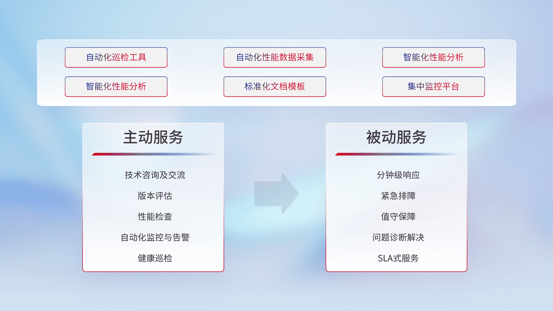 智能化工具和标准化文档,,,,保障服务质量,,,提供主动服务(包含技术咨询、、、版本评估、、、性能检查、、自动化监控与告警、、、健康巡检)和被动服务包含(分钟级响应、、紧急排障、、值守保障、、、、问题诊断解决、、SLA服务)。。
